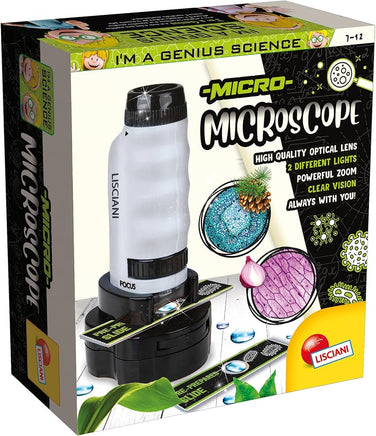 The Micro-Microscope is a compact, 2-in-1 scientific tool. It functions as a traditional laboratory microscope with slides, but its light weight and battery-powered LED make it ideal for field research in nature.