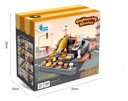 An inertial sliding track playset that operates without batteries, using mechanical buttons and levers to move cars through various obstacles. This specific set typically comes with 2 engineering vehicles (such as a crane or truck) and a multi-level track.
