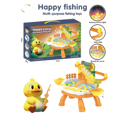 The set features dynamic music and shining lights to attract attention. It combines a musical duck slide with a magnetic fishing pond activity. Simulates a fishing experience, potentially with flowing water