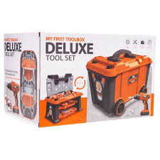 The "my firstbox deluxe toolset" appears to be a child's toy tool set designed for pretend play, likely made of plastic and intended to be safe for young children. This tool set is designed for pretend play and early learning, not for real-world repair or construction tasks. The set comes in a sturdy carry case, allowing all the tools to fit perfectly inside for storage and transport.