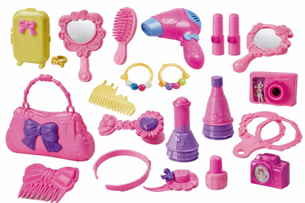 Includes multiple beauty accessories (comb, brush, toy dryer, lipstick, perfume, jewelry, and more)