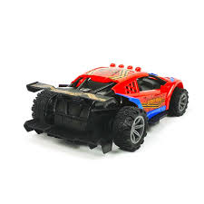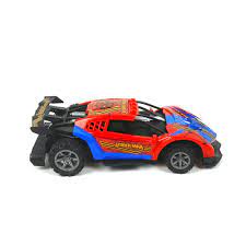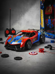 Avengers Super Hero features a red and blue design with a spoiler and a web pattern, often coming with a simple remote control.  Inspired by the superhero Spiderman, featuring the character's signature red and blue colors and web designs. Many similar generic models include multi-color flashing lights, and some have "drift" capabilities or can perform stunts like 360-degree rotations. While the specific car in the image is likely generic, recognized brands like Jada Toys and Hasbro also make officially licensed Spiderman vehicles.