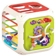 This incredible cube challenges young minds with classic shape sorting activities, rotating gears, and colorful bead mazes