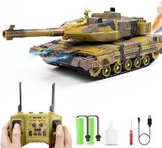 The Remote Control (RC) Simulation Tank is designed for multi-sensory military simulation for both kids and hobbyists. The tank features a 330° to 360° rotating turret and a shooting function that fires safe water beads (gel bullets) or BBs. It includes built-in smoke exhaust (simulated by adding water), authentic engine sounds, machine gun noises, and LED lights.